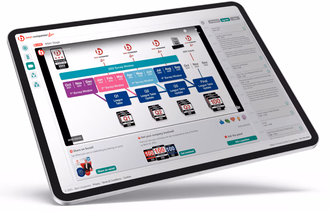 Join Best Companies Live to attend the next live event and gain instant access to hours of employee engagement and HR best practice.Best Companies Live has provided insights to 10,000's of passionate professionals to help them realise the potential an engaged workforce has on business performance. By joining the Best Companies community you will gain access to hours of best practice and masterclasses to help you improve engagement, motivate employees, and become a worldclass place to work
